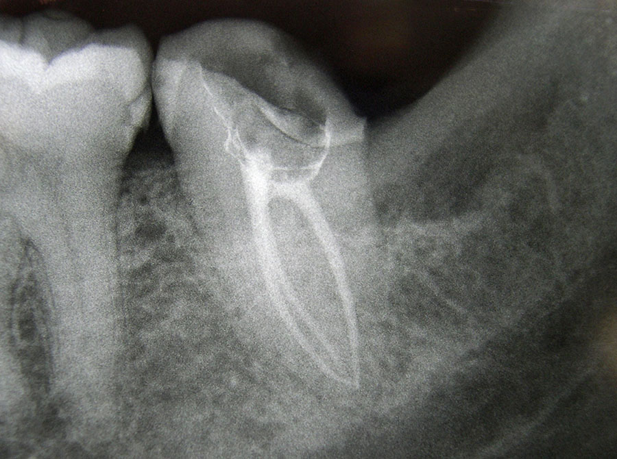 Sonst kann es durch fortschreitende bakterielle Zersetzungsprozesse zu einer Entzündung an der Wurzelspitze des Zahnes kommen, die sich in den Knochen ausbreitet.